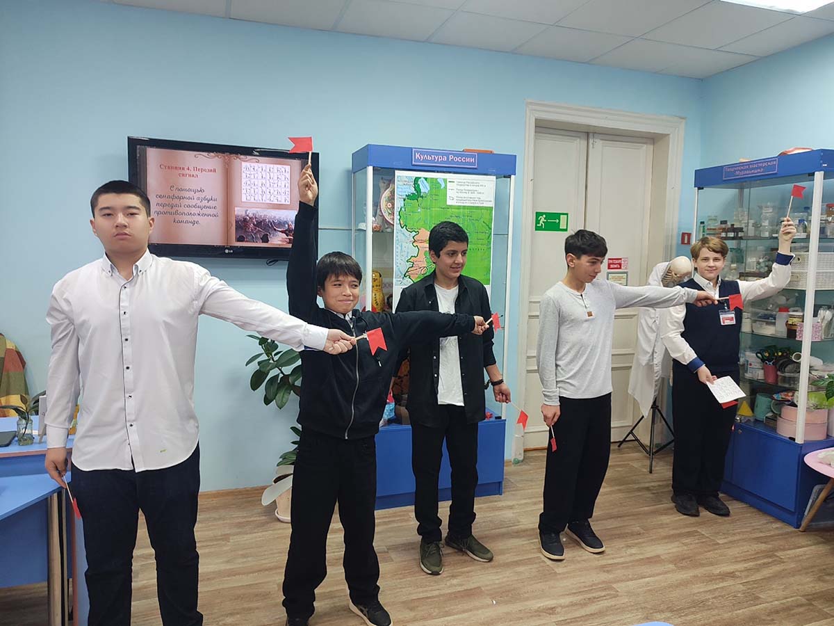 Историческая интеллектуальная игра «Под знаменем единства» была проведена для учащихся 8 класса школы № 52. Библиотекарь Лилия Александровна Седнина начала игру с объяснения понятия «единство». Учащимся было предложено изобразить единство мимикой и жестами, стать единым целым. Следующим этапом стало изучение портретов исторических деятелей, чтение карт, передача сообщений с помощью русской семафорной азбуки. И как понятна стала обстановка в мире и стране XVII века! Завершением встреи стала инсценировка воззвания Минина к сбору средств для народного ополчения. Все включились в объединяющую игру.