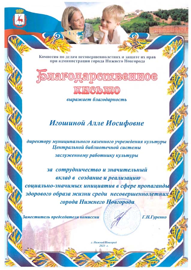 Игошина Алла Иосифовна, директор МКУК ЦБС Канавинского района, получила благодарственное письмо от комиссии по делам несовершеннолетних и защите их прав при администрации Нижнего Новгорода за сотрудничество и значительный вклад в создание и реализацию социально-значимых инициатив в сфере пропаганды здорового образа жизни среди несовершеннолетних города Нижнего Новгорода.