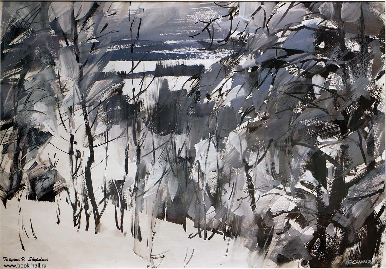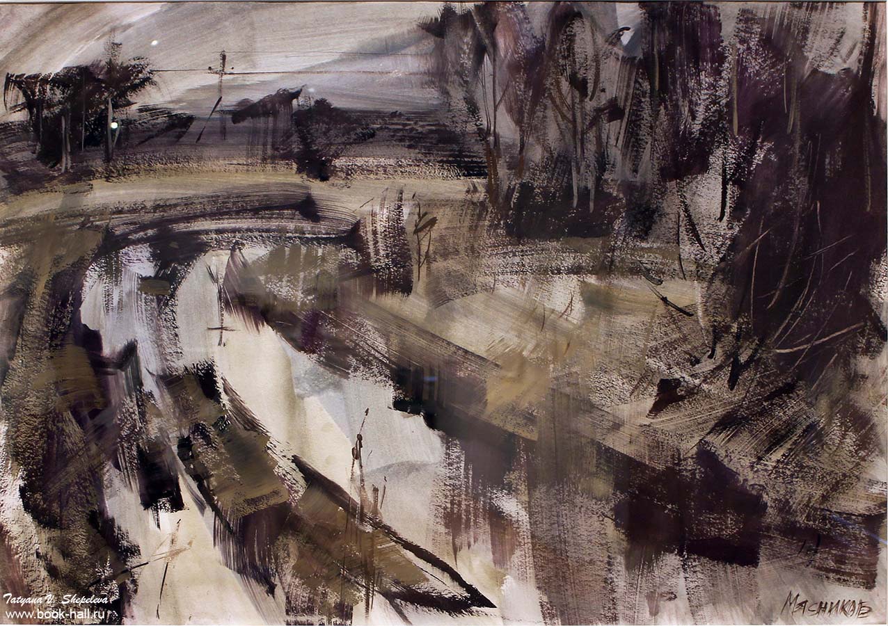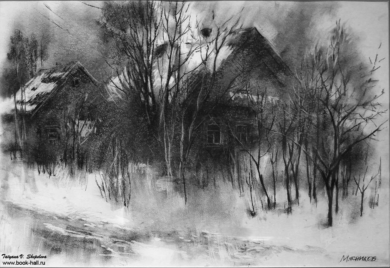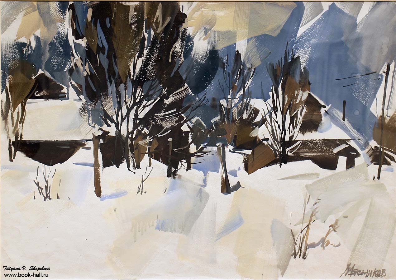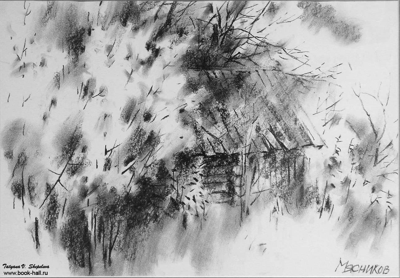 Работа с натуры определяет особенности художественного языка автора и позволяет ему добиться точности в передаче атмосферных явлений. Живя за городом, мастер не упускает возможности пленэра в любое время. По его признанию, работать в мороз комфортнее, чем в жару. Зима — одно из любимых времен года художника. Как истинный график, он восхищается ее контрастами. Зима Алексея Мясникова выразительна независимо от того, в какой технике она воплотилась на листе бумаги.