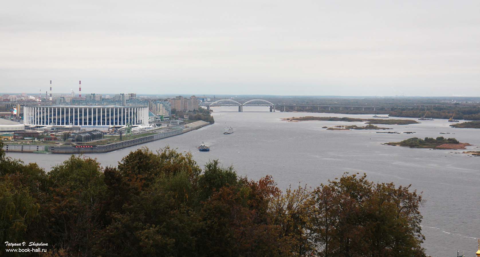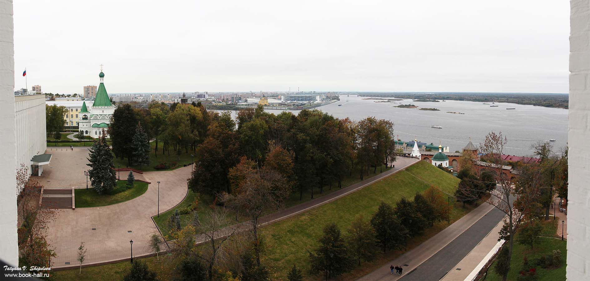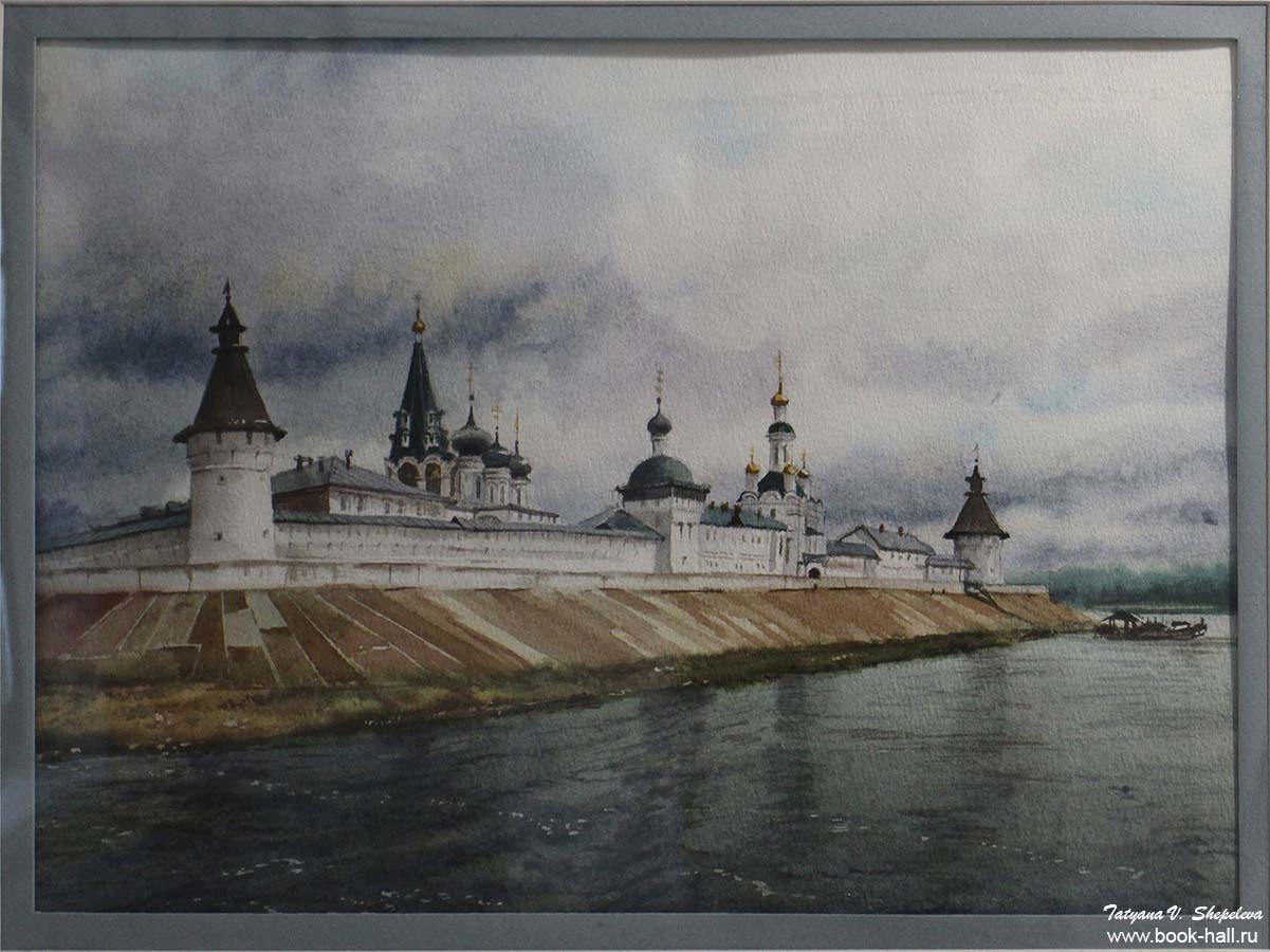 Заново отстроенная к 800-летию Нижнего Новгорода колокольня Спасо-Преображенского собора, некогда находившегося на территории Нижегородского кремля, — довольно специфическое, на мой взгляд, место для проведения выставок. Со всех сторон из окон бьет яркий дневной свет. Не лучший вариант для просмотра живописных работ и особенно графики (акварели), находящейся под стеклом. Мне еще повезло, что день был пасмурный, — удача для фотосъемки акварелей, но неудача для фотографирования прекрасных видов, что открываются со смотровой площадки. Именно здесь находятся колокола, чей мелодичный звон последние годы стал дополнительным украшением и визитной карточкой кремля.