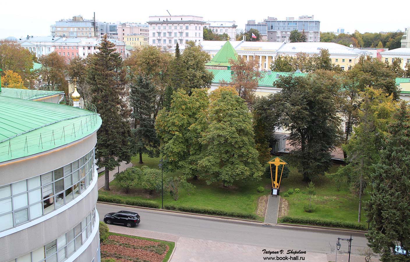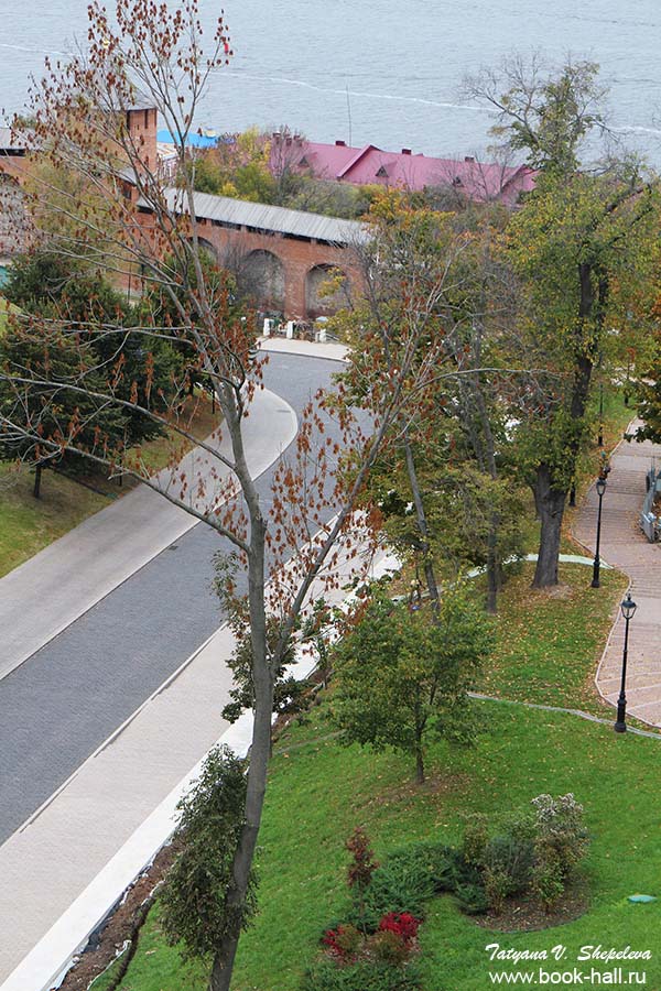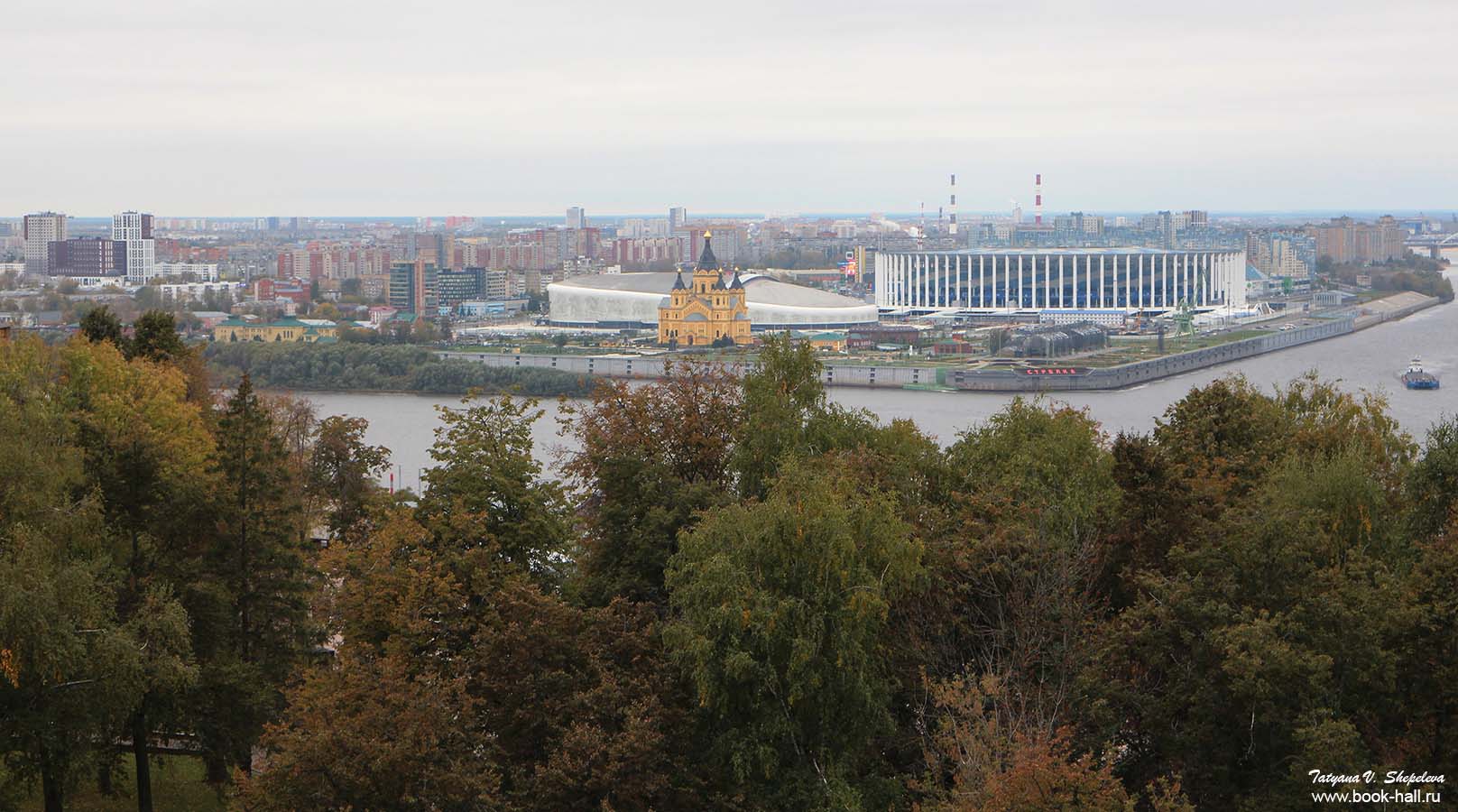 Заново отстроенная к 800-летию Нижнего Новгорода колокольня Спасо-Преображенского собора, некогда находившегося на территории Нижегородского кремля, — довольно специфическое, на мой взгляд, место для проведения выставок. Со всех сторон из окон бьет яркий дневной свет. Не лучший вариант для просмотра живописных работ и особенно графики (акварели), находящейся под стеклом. Мне еще повезло, что день был пасмурный, — удача для фотосъемки акварелей, но неудача для фотографирования прекрасных видов, что открываются со смотровой площадки. Именно здесь находятся колокола, чей мелодичный звон последние годы стал дополнительным украшением и визитной карточкой кремля.