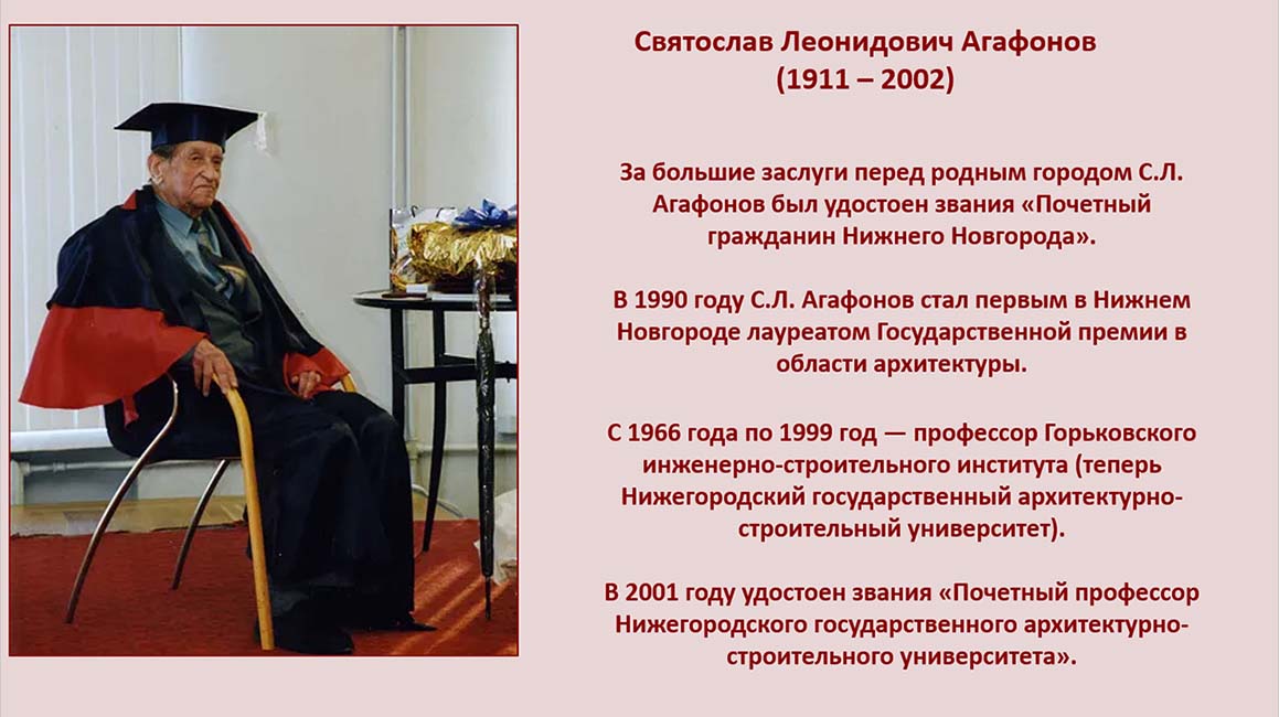 В 1990 году С.Л. Агафонов стал первым в Нижнем Новгороде лауреатом государственной премии в области архитектуры. (Похоронен на городском кладбище на улице Пушкина). |