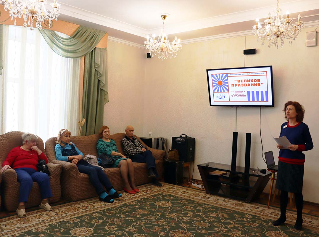 Сотрудники библиотеки им. А.Н. Островского провели для пенсионеров Государственного бюджетного учреждения «Комплексный центр социального обслуживания населения Нижегородского района города Нижнего Новгорода» час вопросов и ответов «Великое призвание».