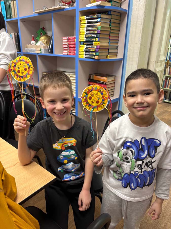 В библиотеке звучали и традиционные весенние заклички — дети дружно выкрикивали старинные слова, призывающие солнце и тепло, словно помогая весне прогнать последние остатки зимнего сна. Завершилось праздничное гулянье творческим мастер‑классом: каждый ребёнок создал свой собственный символ Масленицы — яркое, лучистое солнце.