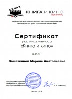 Вашаткина Марина Анатольевна, главный библиотекарь сектора маркетинга отдела методической работы и маркетинга, приняла участие в конкурсе "Книга и кино", организованном Некоммерческим фондом «Пушкинская библиотека» при поддержке Федерального агентства по печати и массовым коммуникациям на Интернет - портале «Чтение-21» в рамках объявленного в России «Года российского кино», и получила сертификат участника за интерактивную афишу "Синдром "Петрушки".