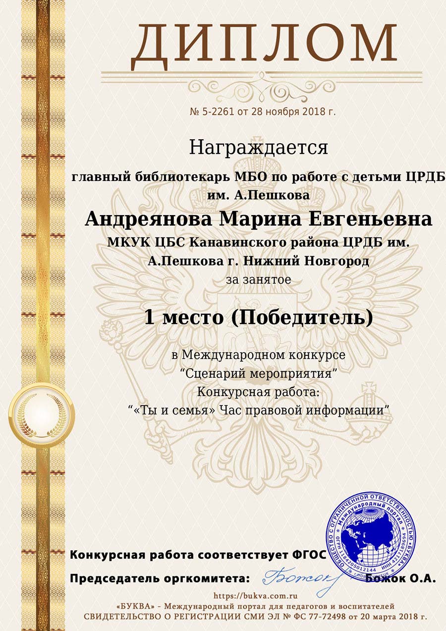 Андреянова Марина Евгеньевна, главный библиотекарь МБО по работе с детьми ЦРДБ им. А. Пешкова МКУК ЦБС Канавинского района, награждена дипломом Международного портала «Буква» за победу (I место) в конкурсе «Сценарий мероприятия» с работой «Ты и семья. Час правовой информации».
