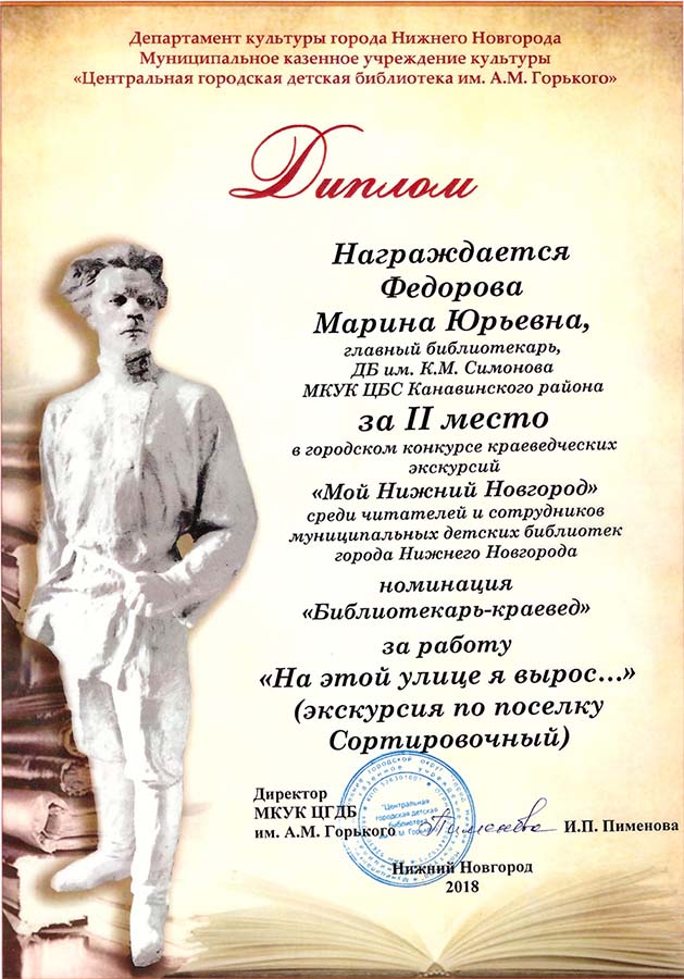 Федорова Марина Юрьевна, главный библиотекарь среднего абонемента детской библиотеки им. К. Симонова МКУК ЦБС Канавинского района награждена Дипломом за 2 место в городском конкурсе краеведческих экскурсий «Мой Нижний Новгород» среди читателей и сотрудников муниципальных детских библиотек города Нижнего Новгорода номинация «Библиотекарь-краевед» за работу «На этой улице я вырос…» (экскурсия по поселку Сортировочный).