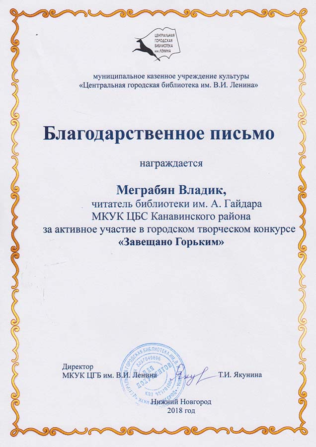 За активное участие в международной сетевой акции "Максим Горький 150", организованной Нижегородской государственной областной детской библиотекой, коллектив "Централизованной библиотечной системы" Канавинского района награжден сертификатом участника. Акция приурочена к 150- летию великого русского писателя.
