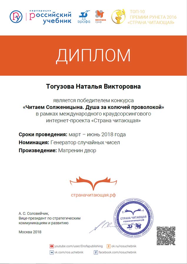 Библиотекарь информационно-досугового зала библиотеки им. А.С. Грибоедова Тогузова Наталья Викторовна приняла участие в конкурсе «Читаем Солженицына. Душа за колючей проволокой» в рамках международного краудсорсингового интернет-проекта «Страна читающая», организованного издательством «Дрофа», Ассоциацией деятелей культуры, искусства и просвещения по приобщению детей к чтению «Растим читателя», и получила Диплом победителя за видеоролик по рассказу А.И. Солженицына «Матрёнин двор».