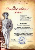 МКУК "Центральная городская детская библиотека им. А.М. Горького" выражает благодарность Калининой Ирине Анатольевне, заведующей методико-библиографическим отделом по работе с детьми ЦРДБ им. А. Пешкова, за активное участие и выступление на тему "Театр теней как новый способ сценического воплощения сказочного мира М. Горького" на творческой лаборатории инновационных библиотечных практик "Максим Горький – писатель совершенно необходимый сегодня".