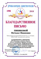Пинякова Наталья Ивановна, заведующая библиотекой им. А. Гайдара, получила Благодарственное письмо Совета Ассамблеи народов России за организацию и проведение XVI Конгресса народов России «20 лет Ассамблеи народов России: итоги и перспективы. Информационная безопасность в сфере межнациональных отношений в контексте развития цифровой экономики Российской Федерации».