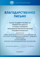 Руководство Централизованной библиотечной системы Канавинского района получило благодарственное письмо от Всероссийской общественной организации "Русское географическое общество" за помощь в проведении международной образовательной акции "Географический диктант" в 2017 году.