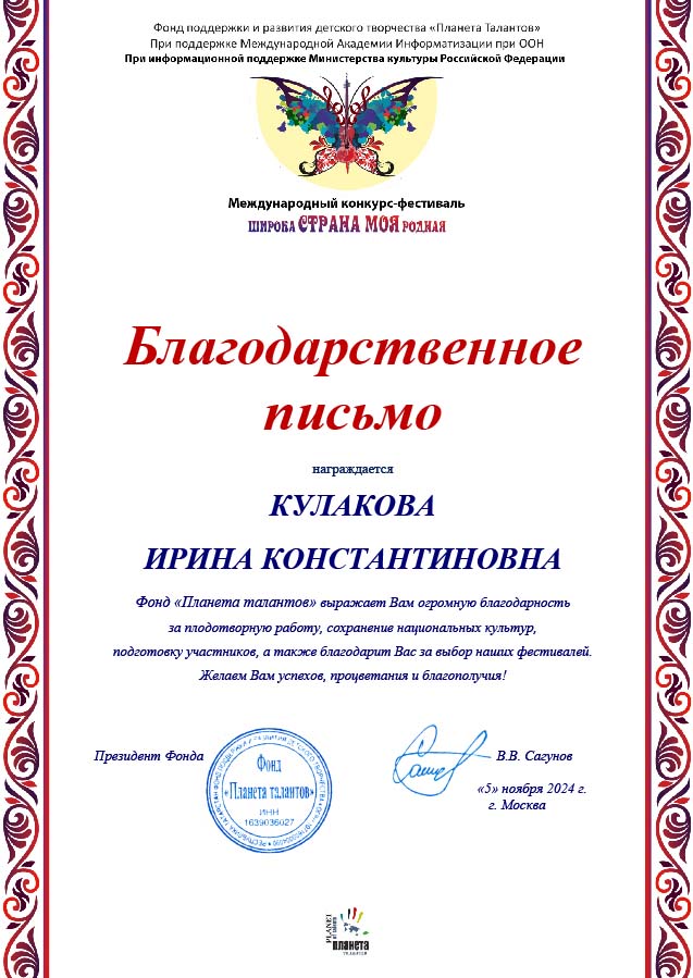 Кулакова Ирина Константиновна, сотрудница ЦРДБ им. А. Пешкова, отмечена благодарственным письмом Международного конкурса-фестиваля «Широка страна моя родная» за плодотворную работу, сохранение национальных культур, подготовку участников.