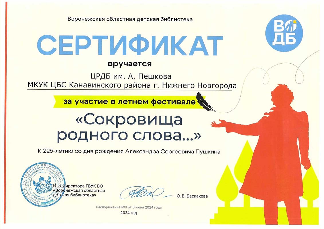 Коллектив Центральной районной детской библиотеки им. А. Пешкова получил от Воронежской областной детской библиотеки сертификат за участие в летнем фестивале «Сокровища родного слова» к 225-летию со дня рождения Александра Сергеевича Пушкина.