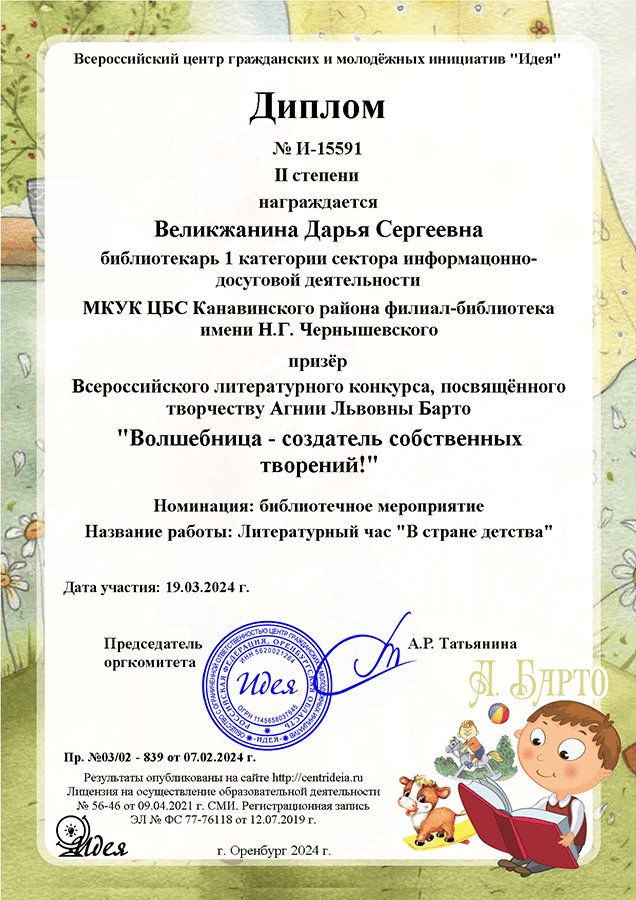 Великжанина Дарья Сергеевна, библиотекарь I категории сектора информационно-досуговой деятельности библиотеки им. Н.Г. Чернышевского, получила диплом II степени в номинации «Библиотечное мероприятие» Всероссийского литературного конкурса, посвященного творчеству Агнии Львовны Барто.