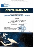 Центральная районная детская библиотека им. А. Пешкова получила сертификат участника областной библиотечной акции «"Книжный космос": от Павлова до Гагарина». Организатором акции является НГОДБ имени Т.А. Мавриной.