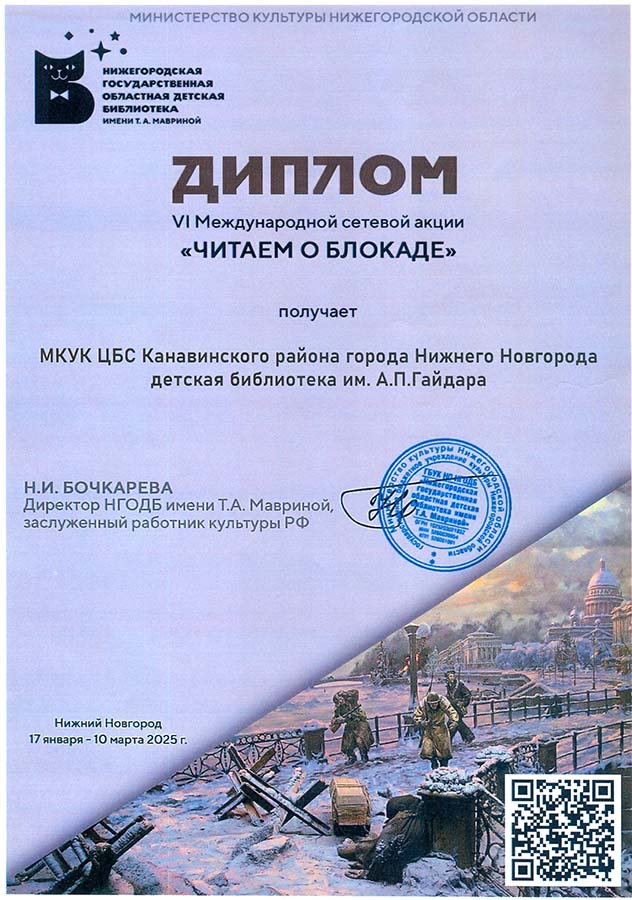 Детская библиотека им. А. Гайдара МКУК ЦБС Канавинского района награждена Дипломом VI Международной сетевой акции «Читаем о Блокаде».