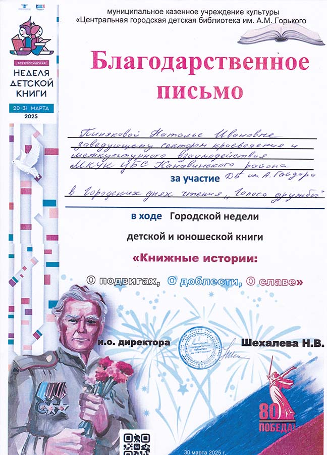 Пинякова Наталья Ивановна отмечена благодарственным письмом за участие в городских днях чтения «Голоса дружбы» в ходе Городской недели детской и юношеской книги «Книжные истории».