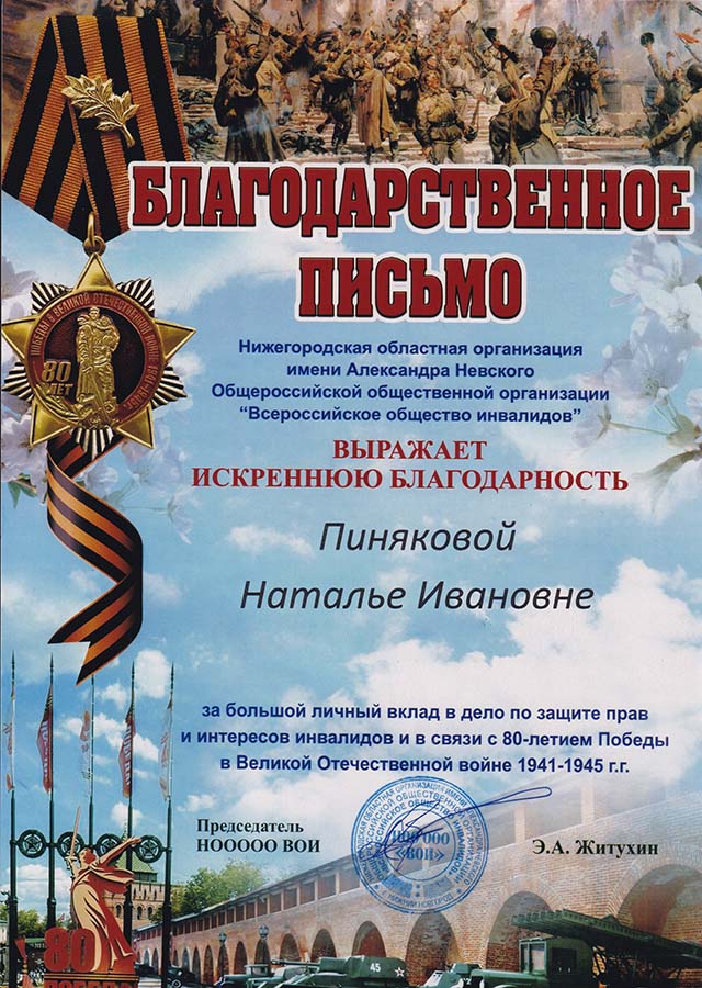 Пинякова Наталья Ивановна отмечена благодарственным письмом за большой личный вклад в дело по защите прав и интересов инвалидов и в связи с 80-летием Победы в Великой Отечественной войне 1941-1945гг.