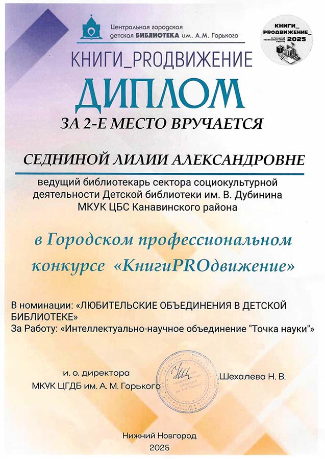 Седнина Лилия Александровна, ведущий библиотекарь сектора социокультурной деятельности библиотеки им. В. Дубинина, награждена Дипломом за 2 место в Городском профессиональном конкурсе «КнигиPROдвижение» в номинации «Любительские объединения в детской библиотеке» за работу «Интеллектуально-научное объединение “Точка науки”».