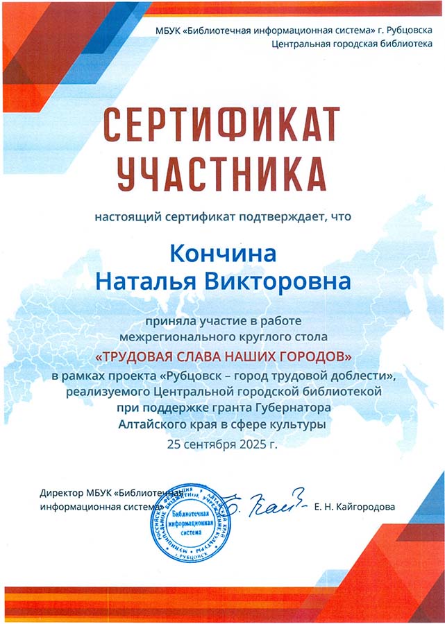 Кончиной Наталье Викторовне, заведующей библиотекой им. А. Гайдара, вручен сертификат участника межрегионального круглого стола «Трудовая Слава наших городов» в рамках проекта «Рубцовск – город трудовой доблести».
