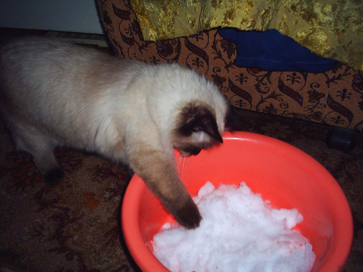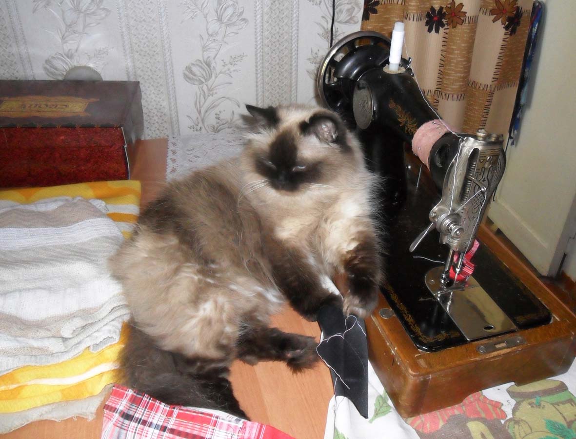 Начнем с Муси, играющей в прятки и изучающей снег, царственно возлежащей на "троне" и помогающей хозяйке шить на машинке: