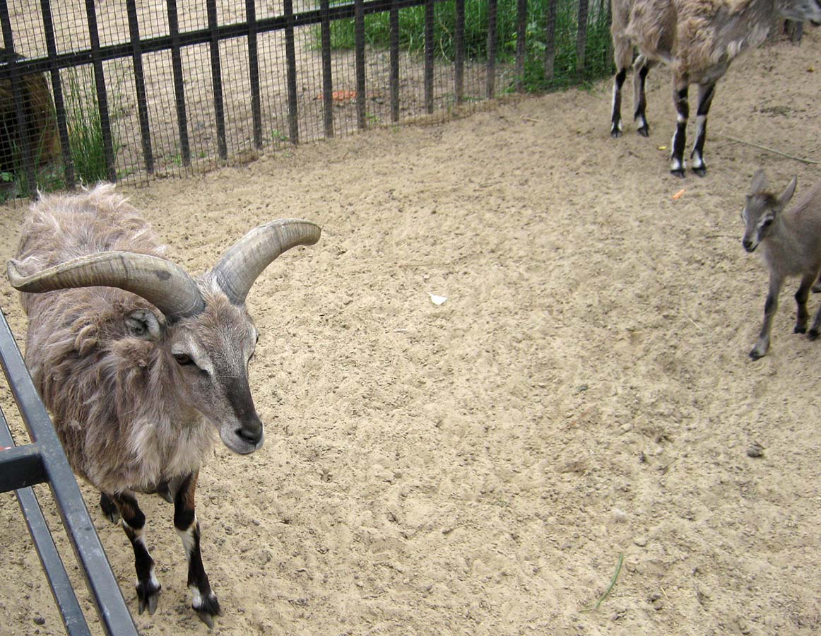 Необычайное веселье царило у вольера с голубыми баранами. Кстати, эти животные - очень близкие родственники горных козлов, им присущи черты и козлов, и баранов, и даже их латинское название Pseudois переводится именно как "ложный баран". В этой семье случилось прибавление. Прелестный игривый малыш с засохшей, но еще не оторвавшейся пуповиной, задорно скакал по песку, вызывая бурю восторга не только у детей, но и у взрослых своими милыми чудачествами. Сердитый папа, увенчаный парой массивных рогов, пытался его воспитывать, причем, довольно сурово, но малютка каждый раз ловко избегал "порки".