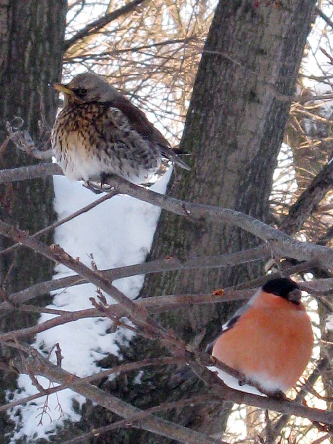 Каждый год зимой к нам прилетают снегири, лакомятся рябиной, радуют нас своей красотой. А зима 2010-2011 года была особенной. К нам прилетали птицы, которых мы раньше никогда не видели в нашем городе, - дрозды-рябинники, зеленушки, лазоревки. Видимо, та зима была чересчур голодной, если птицы полетели даже в города.