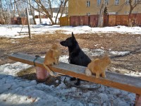 Еще один новый автор проекта - Татьяна Ивановна Коротких - запечатлела вот эту сценку: собака привязана к скамейке явно с целью охранять двух рыжих котеек от посягательств извне.
