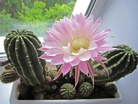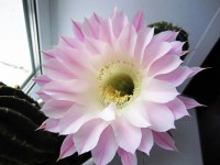 Уже много лет подряд радуют мою семью своим цветением наши кактусы. Вчера утром расцвел на подоконнике первый цветок этого лета.