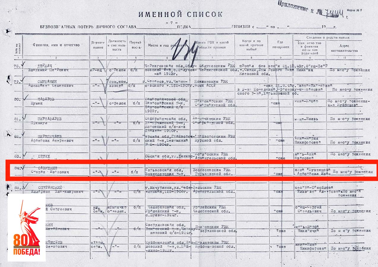 23 июня 1941 года — на следующий день после начала Великой Отечественной войны — из села Нарышкино Вознесенского района Горьковской области ушёл на фронт красноармеец Степан Иванович Савушкин. Дома его остались ждать жена Анастасия Ивановна и годовалая дочь Александра.