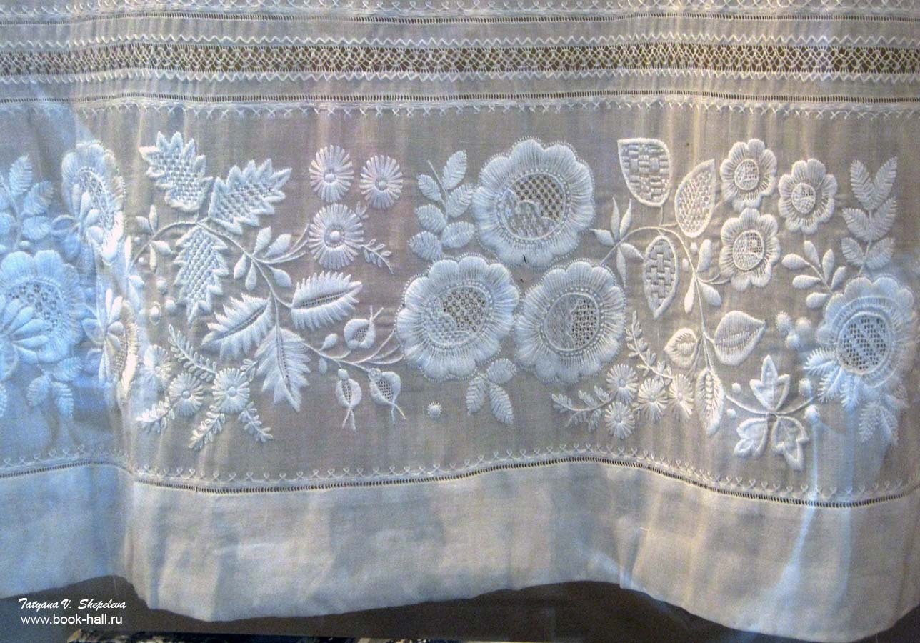 Потрясающе красива вышивка белой гладью! На тончайшем, прозрачном маркизете кладутся плотные атласные стежки белым мулине – и получается практически объемная, очень выразительная картинка. В музее представлены большие панно, выполненные Заслуженным художником РСФСР, участницей многих отечественных и международных выставок Татьяной Мефодьевной Дмитриевой-Шульпиной. Особенно хорошо панно «Золушка».