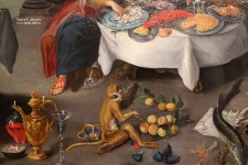 Как это принято у Брейгелей, любой персонаж, любая деталь полны определенного смысла, который нам, «жителям двадцать первого столетья», если перефразировать А. Вознесенского, трудно уловить без определенных знаний о нравах и представлениях тех, кто жил в Европе в Средневековье. Во времена Яна Брейгеля Младшего обезьянка была атрибутом вкуса в столь модных аллегориях пяти чувств. Сидящая на полу и пьющая из бокала вино, она, с одной стороны, намекает на достаток дома, где происходит действие картины, а с другой – является символом дьявольского начала, похоти, сладострастия. Персики в христианской символике, как и яблоко, означают грехопадение, а фиговые плоды – похоть и плодовитость. Раскрытые устричные раковины – а ведь именно устрицами и лакомится героиня этой картины! – являются деликатесом, стимулирующим сексуальность; в средневековой символике они несли мощный эротический подтекст и одновременно обозначали душу, готовую покинуть земную оболочку. А между тем уже упомянутый выше виноград, символ святого причастия и непорочной крови христовой, пролитой на кресте, стоит нетронутым. Гастрономические предпочтения пирующих весьма красноречиво свидетельствуют о греховности происходящего. В правом нижнем углу картины среди прочей дичи лежит убитый павлин, символизируя собой попранное бессмертие. Уж не продала ли дьяволу свою бессмертную душу эта прекрасная дама в погоне за сиюминутным наслаждением, предавшись греху чревоугодия в компании соблазняющего ее сатира?