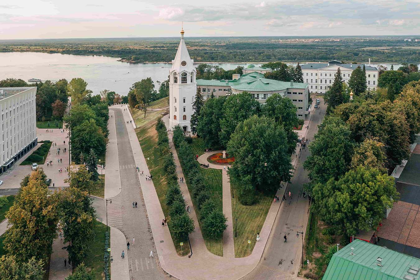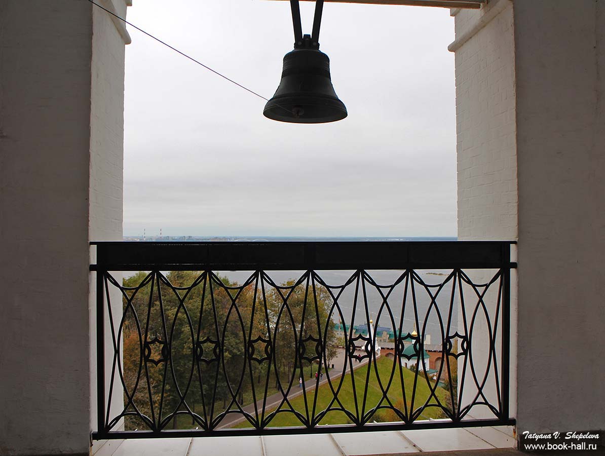 Заново отстроенная к 800-летию Нижнего Новгорода колокольня Спасо-Преображенского собора, некогда находившегося на территории Нижегородского кремля, — довольно специфическое, на мой взгляд, место для проведения выставок. Со всех сторон из окон бьет яркий дневной свет. Не лучший вариант для просмотра живописных работ и особенно графики (акварели), находящейся под стеклом. Мне еще повезло, что день был пасмурный, — удача для фотосъемки акварелей, но неудача для фотографирования прекрасных видов, что открываются со смотровой площадки. Именно здесь находятся колокола, чей мелодичный звон последние годы стал дополнительным украшением и визитной карточкой кремля.